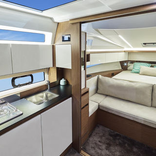 Below, is an impressive and spacious interior volume and refined design. Long windows in the hull offer impressive sea views and bathe the interior in natural light. The functional layout lends itself to spending enjoyable moments on board: the galley features numerous storage solutions, and the head compartment offers a high level of comfort with a shower partition.